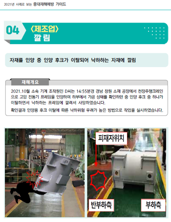 - 2021년 10월 소속 기계 조작원인 D씨는 경남 창원 소재 공장에서 천장주행 크레인