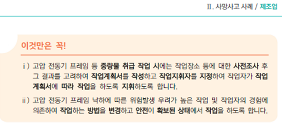 - 고압 전동기 프레임 등 중량물 취급작업 시에는 작업장소 등에 대한 사전조사 후